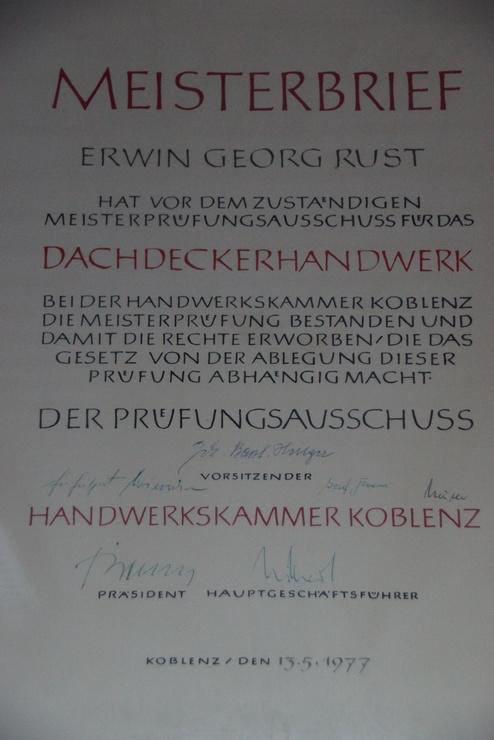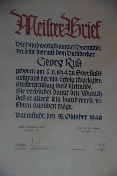 1948 legte mein Opa Georg Rust mit seinem bestandenen Meisterbrief den Grundstein für die Dachdeckertratition in der Familie