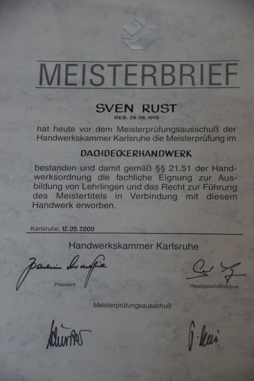 Im Jahr 2000 legte ich Sven Rust meine Meisterprüfung im Dachdeckerhandwerk ab und führe nun seit 2010 die Firma im Familiennamen und Tradition weiter.